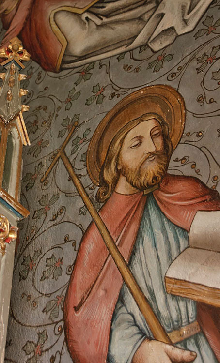 Peintures murales à gauche saints Pierre et André au centre la Vierge à l’enfant, au-dessus un « Schweistuch » (une Sainte-Face), à droite : saints Jean-Baptiste et Jacques-le-Mineur.