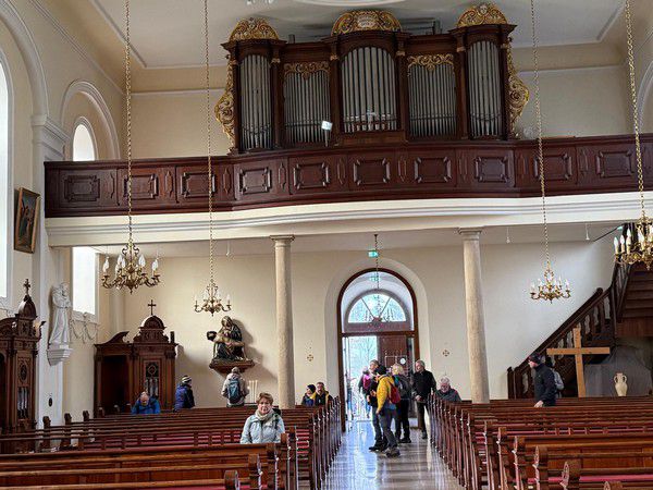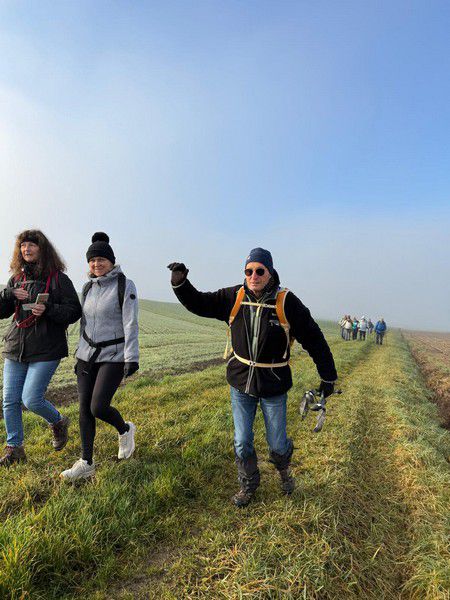 16 participants et un toutou au rendez-vous. La balade s’est déroulée dans une atmosphère hivernale et le soleil peinait à faire quelques apparitions. Pas de vue sur les Vosges du fait du brouillard ; par contre, on a pu apercevoir quelques chevreuils au loin ! Passant tout près du village de BERNWILLER, nous sommes allés visiter l’église Saint-Jean dont la particularité est son clocher à bulbe néo-byzantin. Par chance, elle était ouverte !