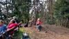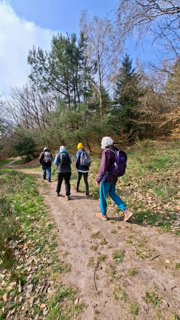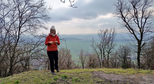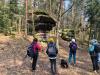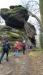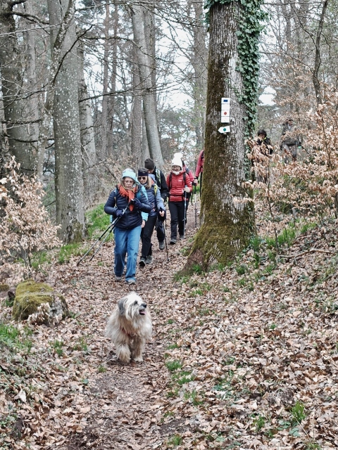 Après de bons efforts de covoiturage (5 voitures pour 14 personnes et deux toutous !), nous nous sommes retrouvés dans une ambiance plutôt froide, sous un ciel nuageux, prêts à attaquer une belle montée pour nous réchauffer. Après cette grimpette d’échauffement, nous étions sur la barre rocheuse pour la journée, avec le rocher du Daubenschlag pour commencer ; certes le panorama sur la plaine était très voilé par les nuages, mais nous avons pu faire une première pause bien méritée dans (et autour) de l’abri du Club Vosgien. A côté, nous avons découvert les ruines du château du Warthenberg, avec toutes les explications proposées par l’association à l’origine des fouilles, car la découverte de ce château est récente.