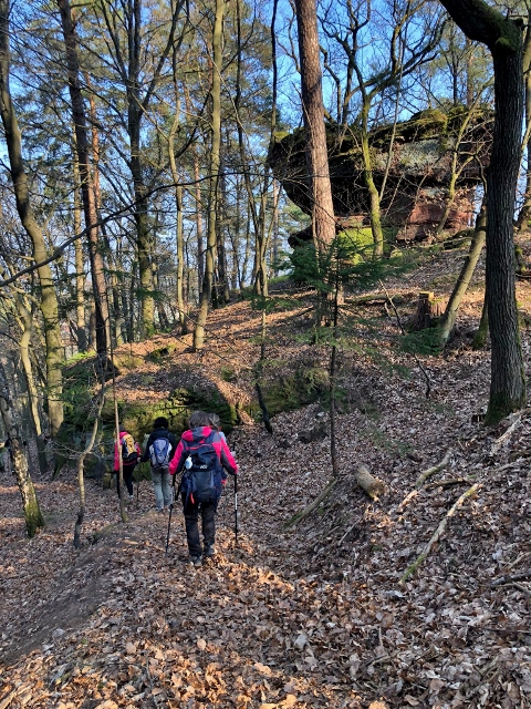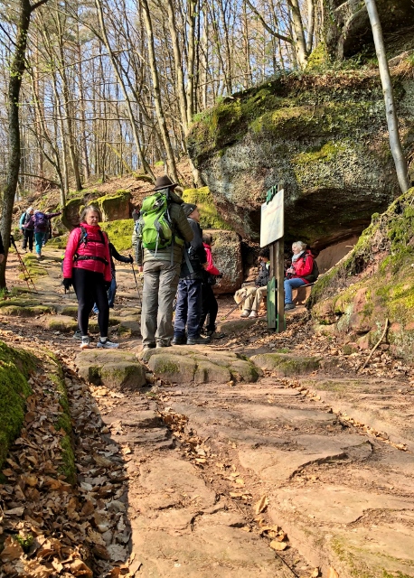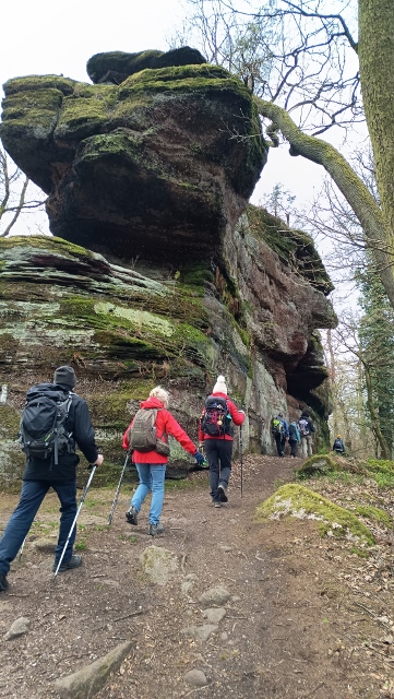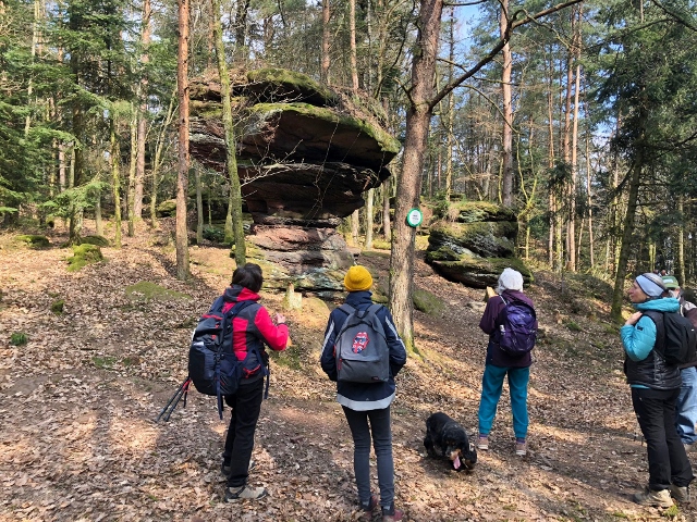 L’itinéraire nous a fait passer ensuite le long du « Hühnerfelsen » (rocher des poules ?) puis du « Kanzenfels » (rocher en forme de chaire du haut duquel il fallait imaginer un druide ou un prêtre en train de prêcher, ou un officier romain en train de haranguer ses troupes…), devant une borne milliaire romaine, au milieu de rochers creusés de cupules (lieu de purification ou de sacrifices ?). Il faut dire que tout ce promontoire rocheux a été habité depuis 7000 ans, par l’homme préhistorique, les celtes, les romains, attirés par les énergies telluriques du lieu, sans compter les sorcières et les fées… Chacun y a laissé quelques empreintes. Et comme il n’y a pas de traces écrites de toutes ces époques, les légendes se sont multipliées.