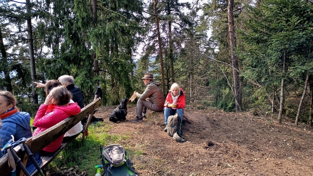Le soleil commence à sortir quand nous arrivons à un belvédère sur la plaine, doté d’un double banc déjà réchauffé par les rayons bienfaisants : et si nous mangions là ? Pas difficile de convaincre ceux qui n’ont pas encore faim, l’endroit est favorable et il y fait si bon ! Bon appétit à tous !