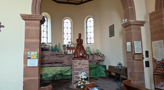 La chapelle est relativement dépouillée, mais lumineuse et « parlante » : on peut y admirer plusieurs représentations de Saint Michel terrassant le dragon, une magnifique statue en bois d’une femme en prière (en remerciement de la population pour la protection de la cité pendant la 2ème guerre mondiale) et qui invite à la prière, et une maquette de la chapelle, de la grotte et du chalet du Club Vosgien. En période de Noël cette maquette accueille une magnifique crèche.