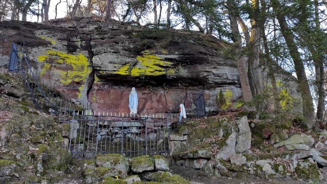 Toujours est-il que l’endroit est mystérieux : aucune trace écrite n’a pu expliquer le rôle de ce cercle ou bassin, et donc les légendes vont bon train : des fées, ou des sorcières se réunissaient-elles là, pour écouter la « maîtresse » ou pour s’envoler ensemble vers leur lieu favori, le Bastberg, un peu plus à l’Ouest ? Loin de nous envoler, nous, nous descendrons par un escalier à la grotte qui se trouve 11 mètres en-dessous de ce cercle étrange. Ce lieu humide et sombre a dû être habité depuis le néolithique, des ermites s’y sont succédé, des cultes ont dû y être célébrés et bien sûr les légendes y ont fait vivre fées et sorcières !