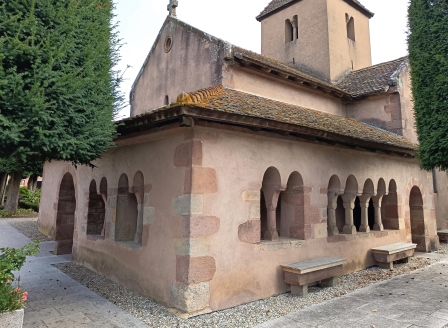 La balade débute par un passage sous un porche sculpté et la découverte de la magnifique abbaye bénédictine du 12ème siècle puis le chemin se poursuit en montant vers le col du Wolfsgrube à 672 mètres.