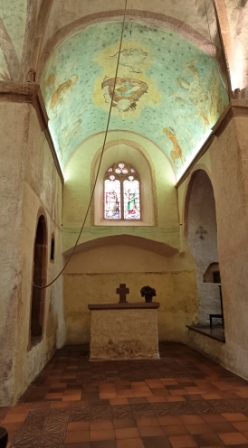 On le voit aussi au plafond de la nef sur un tableau du peintre René Kuder, en protecteur rayonnant de sainteté, apparaissant sur une nuée claire, accompagné d’un ange.
