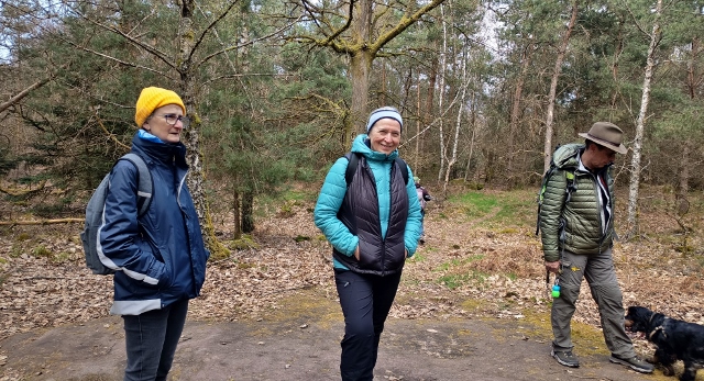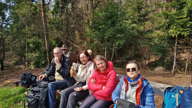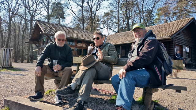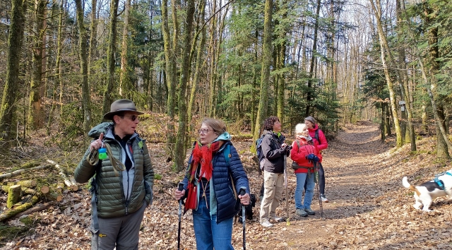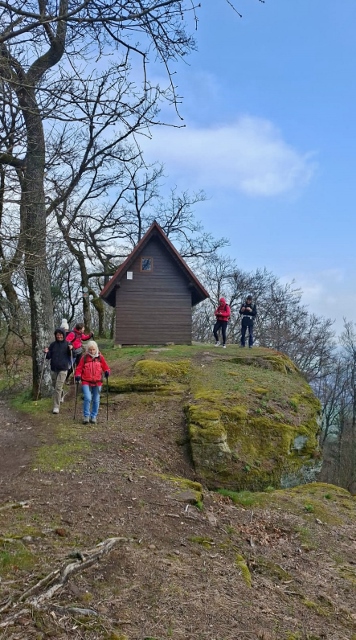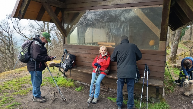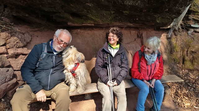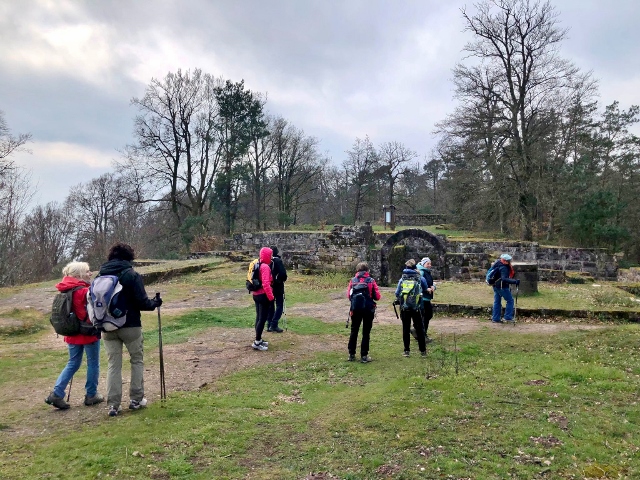 Après de bons efforts de covoiturage (5 voitures pour 14 personnes et deux toutous !), nous nous sommes retrouvés dans une ambiance plutôt froide, sous un ciel nuageux, prêts à attaquer une belle montée pour nous réchauffer. Après cette grimpette d’échauffement, nous étions sur la barre rocheuse pour la journée, avec le rocher du Daubenschlag pour commencer ; certes le panorama sur la plaine était très voilé par les nuages, mais nous avons pu faire une première pause bien méritée dans (et autour) de l’abri du Club Vosgien. A côté, nous avons découvert les ruines du château du Warthenberg, avec toutes les explications proposées par l’association à l’origine des fouilles, car la découverte de ce château est récente.