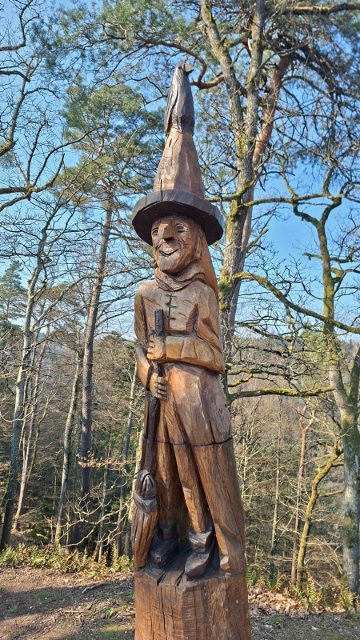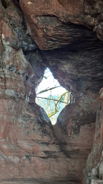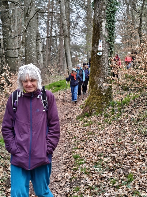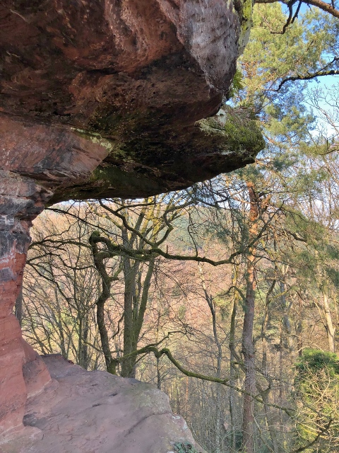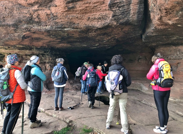 L’itinéraire nous a fait passer ensuite le long du « Hühnerfelsen » (rocher des poules ?) puis du « Kanzenfels » (rocher en forme de chaire du haut duquel il fallait imaginer un druide ou un prêtre en train de prêcher, ou un officier romain en train de haranguer ses troupes…), devant une borne milliaire romaine, au milieu de rochers creusés de cupules (lieu de purification ou de sacrifices ?). Il faut dire que tout ce promontoire rocheux a été habité depuis 7000 ans, par l’homme préhistorique, les celtes, les romains, attirés par les énergies telluriques du lieu, sans compter les sorcières et les fées… Chacun y a laissé quelques empreintes. Et comme il n’y a pas de traces écrites de toutes ces époques, les légendes se sont multipliées.