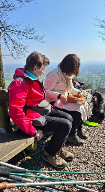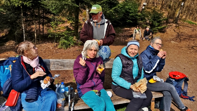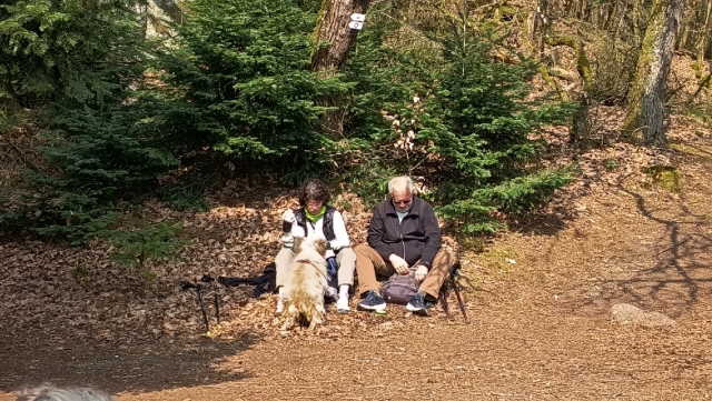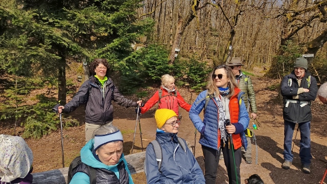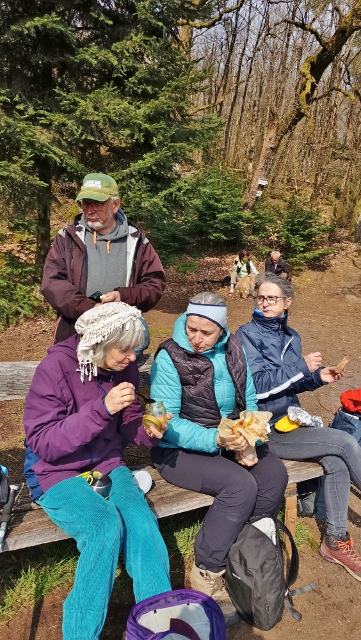 Le soleil commence à sortir quand nous arrivons à un belvédère sur la plaine, doté d’un double banc déjà réchauffé par les rayons bienfaisants : et si nous mangions là ? Pas difficile de convaincre ceux qui n’ont pas encore faim, l’endroit est favorable et il y fait si bon ! Bon appétit à tous !