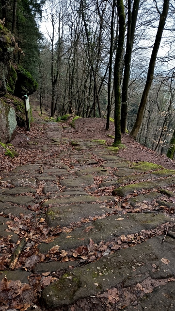 Une fois restaurés, dépassant l’oppidum romain, nous arrivons au « Plattenweg », impressionnant reste d’une chaussée romaine où l’on voit encore les profondes ornières creusées par les roues des chars dans les dalles de grès. Puis nous prenons la direction du sommet du Mont Saint-Michel et de sa chapelle, présente depuis 1371, dédiée à Saint Michel depuis la création de la confrérie Saint-Michel en 1593.