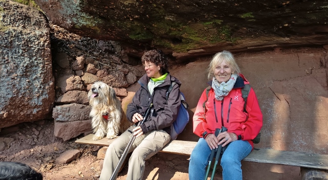Toutes ces légendes (ou les énergies du lieu ?) nous ont bien fait rire, et ont boosté notre imagination… Et chacun de voir telle forme de rocher en lit, en fauteuil, en chaise de bébé ou en baignoire… Facile d’imaginer une vie dans cette grotte, fées et sorcières nous ont inspirés et nous avons passé un agréable moment, avant de remonter sur le promontoire, où les bancs au soleil et le chalet du Club Vosgien nous ont permis de prendre un goûter fort apprécié, merci pour ton excellent gâteau, Christine !