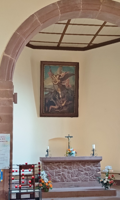 La chapelle est relativement dépouillée, mais lumineuse et « parlante » : on peut y admirer plusieurs représentations de Saint Michel terrassant le dragon, une magnifique statue en bois d’une femme en prière (en remerciement de la population pour la protection de la cité pendant la 2ème guerre mondiale) et qui invite à la prière, et une maquette de la chapelle, de la grotte et du chalet du Club Vosgien. En période de Noël cette maquette accueille une magnifique crèche.